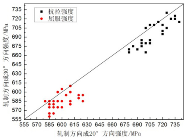 圖 4 熱軋板卷20°和30°位置的拉伸性能對比