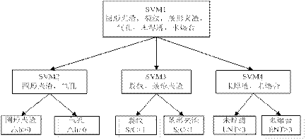 分類(lèi)器構造應優(yōu)先采用類(lèi)別差異性排除法,即在整體結構中,先將相似量作為一類(lèi),然后根據相似量之間的細微變化,再通過(guò)模型算法進(jìn)行區分。這種分類(lèi)在分類(lèi)準確率和平衡準確率上都有極高的效率。本文構造了6種缺陷,裂紋、圓形夾渣、條形夾渣、氣孔、未焊透、未熔合等典型缺陷SVM多類(lèi)分類(lèi)器(圖4)。