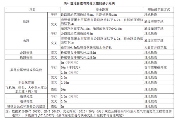 管道設計選線(xiàn)與外界的安全距離可參考表1~7,這些保護距離規定均來(lái)自現行國家或行業(yè)標準或規范。