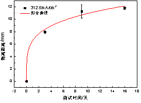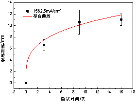 根據建立的陰極剝離預期壽命模型,可以獲得不同電流密度下防腐層剝離距離達到一定值時(shí)的壽命特征(即時(shí)間),在實(shí)際海管陰極保護設計時(shí),可參考此方法,以高電流密度下的壽命特征外推獲得低電流密度下的壽命特征。