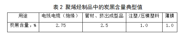 相關(guān)研究表明,炭黑是較好的紫外線(xiàn)穩定劑,能夠通過(guò)吸收紫外線(xiàn)達到防老化目的。一般而言,一定細度的炭黑,濃度達到2%時(shí),即可起到很好的紫外屏蔽作用,考慮到一定的保險系數,用2.5%炭黑對聚烯烴可達到最佳防老化效果。而炭黑添加量在0.5%以下時(shí),防護效果很差。當要求炭黑起穩定和防老化作用時(shí),它的加入量約為2~3%;炭黑在各種塑料制品中的一般填充量見(jiàn)表2。
