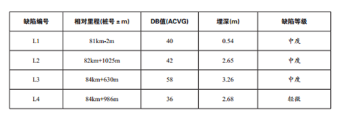 檢測過(guò)程中采取信號電流測試和ACVG檢漏同步進(jìn)行,同時(shí)啟動(dòng)DM接收機的GPS自動(dòng)實(shí)時(shí)測量功能,信號電流檢測及ACVG檢漏每間隔20m采集1次,共采集了350個(gè)數據。通過(guò)分析,共確定4處外防腐層缺陷點(diǎn)。(見(jiàn)下表)
