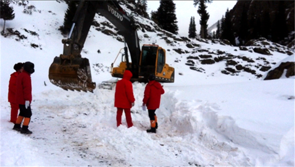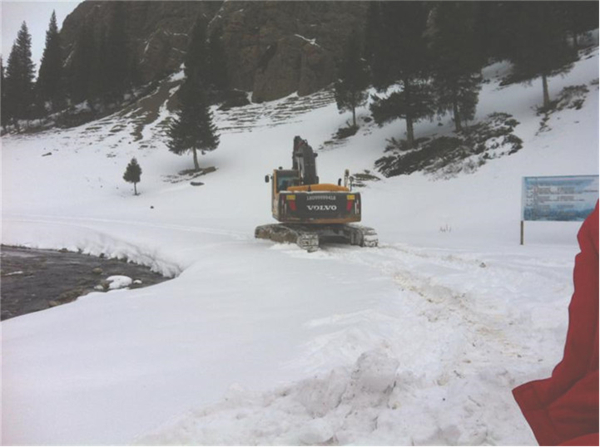 隨著(zhù)深入果子溝腹地,積雪越來(lái)越厚,至4B隧道出口坡道下方時(shí),積雪接近1米,伴行路靠山一側積雪達到1.8~2.0米,挖掘機無(wú)法進(jìn)行壓雪,直至4B隧道出口的坡道,只能在坡道挖雪前進(jìn),挖雪速度為0.33米/分鐘。