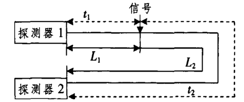 當外界振動(dòng)信號作用于M—Z光纖干涉系統的兩個(gè)干涉臂時(shí),傳感光分別向左右兩個(gè)方向傳輸至探測器1和探測器2(見(jiàn)圖2)。檢測比較兩組干涉光的時(shí)間差即可判斷振動(dòng)事件發(fā)生的位置(見(jiàn)圖3)。
