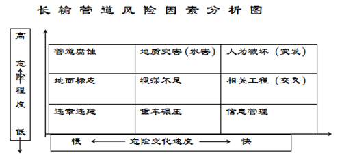 多年來(lái),我們從破壞管道的因素入手,對管道被破壞的機率、危險程度、危險變化速度進(jìn)行風(fēng)險分析,得出圖 1所示結論。