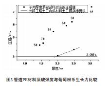 開(kāi)展的管道外防腐層PE材料及防腐層補口材料(PE熱收縮帶)頂破強度(抗穿刺力)實(shí)驗試驗結果證實(shí):在材料下方未附著(zhù)剛性支撐物的情況下,試件頂破時(shí)所需的頂破力(頂破壓強)均大于葡萄根系所能承受3.0MPa的最大土壤推頂力(即:葡萄根系生長(cháng)發(fā)育擴張力),管道外防腐層PE材料試件的頂破強度均大于3.0MPa這一葡萄根系生長(cháng)發(fā)育最大壓力值,見(jiàn)圖3。由此可見(jiàn),葡萄植物根系生長(cháng)發(fā)育產(chǎn)生的擴展力是不能穿透、沖破3PE腐層的。