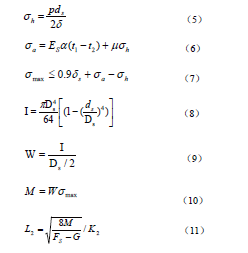 式中σh為內壓產(chǎn)生的環(huán)向應力,MPa;σa為內壓與溫度變化產(chǎn)生的軸向應力,MPa;Es為鋼管彈性模量,取2.0×105,MPa;μ為鋼管泊桑比,取0.3;α為鋼管線(xiàn)膨脹系數,取1.5×10-5,m/(m•℃); t1為管道安裝閉合時(shí)的環(huán)境溫度,℃;t2為管道輸送介質(zhì)的溫度,℃;σe為當量應力,MPa;σs為鋼管的最低屈服強度,MPa;M為鋼管均布荷載最大彎曲力距,N•m;W為鋼管截面系數,m3;I為鋼管截面慣性矩;Ds為鋼管外徑,m;ds為鋼管內徑,m。K2為穩定安全系數,建議取值范圍:1.2~1.5。