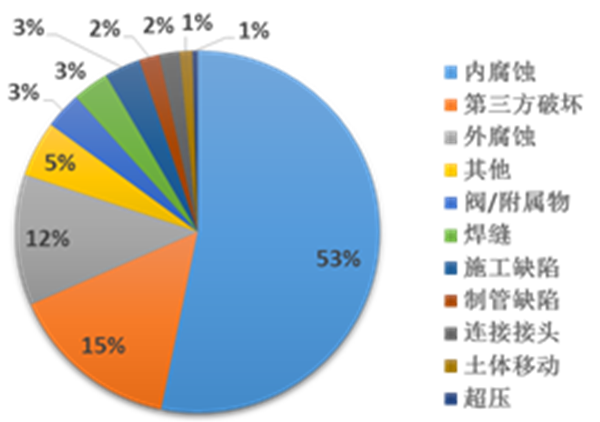 原油、天然氣管道失效原因按比例高低均分別為:內腐蝕、第三方破壞和外腐蝕(圖17、18)。