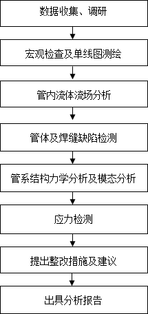 (7)依據管道的受力情況,結合流場(chǎng)分析及應力理論分析結果,提出振動(dòng)減緩措施建議,同時(shí)綜合管道現場(chǎng)檢測評價(jià)結果及管道受力情況,最終確定管道的安全狀況,提出運行維護建議及措施。