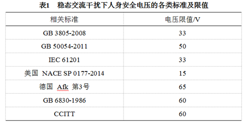 穩態(tài)交流干擾危害,各國標準中人身安全電壓的限值見(jiàn)表 1 [6] 。其中美國NACE標準考慮比較全面,而且一般情況下15 V的穩態(tài)安全電壓容易緩解達到,因此推薦使用。特殊情況下,可設置防觸碰裝置或均壓墊等措施進(jìn)行重點(diǎn)防護。