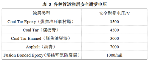 暫態(tài)交流干擾下管道上會(huì )產(chǎn)生很高的交流電壓,嚴重時(shí)會(huì )擊穿管道涂層。Dabkowski[7]給出了各種不同涂層的安全耐受電壓(表 3)。