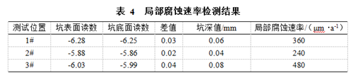 使用ER腐蝕探頭對強交流干擾下管道腐蝕速率進(jìn)行了實(shí)時(shí)監測,監測時(shí)間為2個(gè)月,將ER腐蝕探頭取出后,發(fā)現探頭存在較為嚴重的局部腐蝕現象(圖 2)。采用DDC-II型點(diǎn)腐蝕探測儀對探頭表面3個(gè)位置處的局部腐蝕速率進(jìn)行檢測,結果見(jiàn)表 4,遠超ASTM標準中規定的10 μm/a限值。管道交流腐蝕風(fēng)險較高,亟需對其進(jìn)行緩解。此外,通過(guò)ER探頭測試結果可知試片的平均腐蝕速率為360 μm/a,這相當于0.31 A/m2的直流電流的腐蝕量。而此處的交流電流密度為488.07 A/m2,表明約0.06%的交流電流密度產(chǎn)生了腐蝕。
