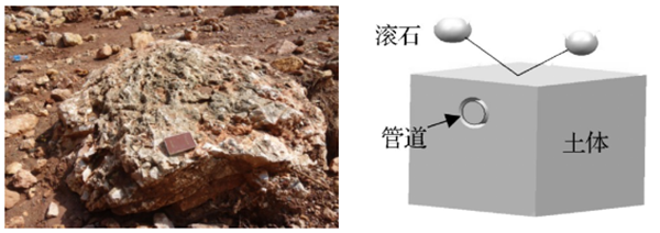 (a.現場(chǎng)照片; b.漂礫撞擊覆土示意圖)