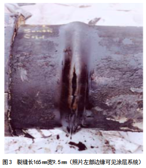 從事故管段切割了16 m長(cháng)管道,在NTSB的實(shí)驗室進(jìn)行了檢測。管道被壓彎,并在壓彎部位的內徑出現了一個(gè)向外突出的彎曲,形成的彎曲角度在5~6度之間。彎曲沿管道周?chē)由旒s270度,從10點(diǎn)鐘位置延伸到7點(diǎn)鐘位置(圖 2)。彎曲區域包括一個(gè)在彎曲頂部敞開(kāi)的裂縫,角度約從2點(diǎn)鐘位置延伸到4點(diǎn)鐘位置。彎曲的最大高度為25 mm,位于彎曲部?jì)葌,?點(diǎn)鐘位置。裂縫最寬部的長(cháng)度為165 mm,寬度為 9.5 mm(圖 3)。管道斷面在顯微鏡下進(jìn)行觀(guān)察,未發(fā)現外部腐蝕現象。