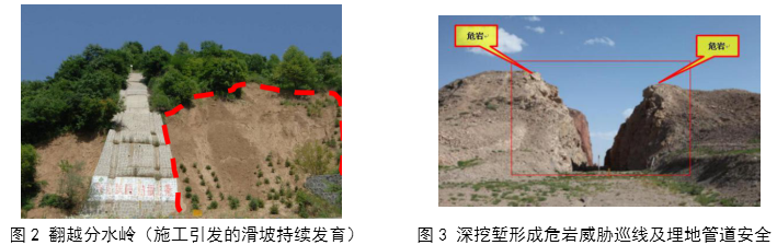 正確的選定線(xiàn)是管道減災防災工作的基礎,既決定了管道的建設和運營(yíng)成本,也決定了未來(lái)管道減災防災工作量。復雜地質(zhì)條件下,越嶺選線(xiàn)和河谷選線(xiàn)十分關(guān)鍵,其好壞基本決定了線(xiàn)路的優(yōu)劣,是整個(gè)線(xiàn)路的關(guān)鍵控制性工程。越嶺位置要盡量避開(kāi)地質(zhì)災害或地質(zhì)災害隱患點(diǎn),大型山嶺的穿越要綜合考慮宏觀(guān)地質(zhì)構造和局部地質(zhì)條件,在盡量繞避或者大角度穿越高地震斷裂帶、地形激變帶時(shí),盡量避開(kāi)大型滑坡和滑坡連續分布地段,巖層順傾地段和厚層堆積層地段,避免施工開(kāi)挖造成新的滑坡和危巖崩塌(圖 2、圖 3)。