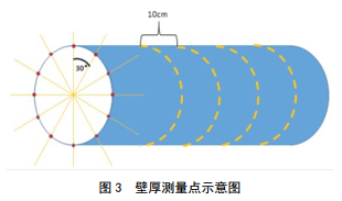 根據報告中GPS數據,定位埋地管道的腐蝕點(diǎn),取腐蝕點(diǎn)軸向±0.5 m作為測試管段開(kāi)挖驗證。以管道截面30°為1個(gè)壁厚測試點(diǎn),進(jìn)行環(huán)向標記,測試環(huán)線(xiàn)間距10 cm(圖 3)。每處腐蝕位置共計檢測120個(gè)壁厚數據并記錄。取壁厚最薄的數據對比磁應力檢測結果,驗證其準確性。