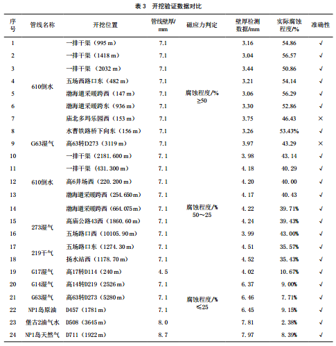 檢測出一級腐蝕點(diǎn)18處,二級腐蝕點(diǎn)544處,三級腐蝕點(diǎn)2 857處,對部分腐蝕點(diǎn)開(kāi)挖驗證,數據對比見(jiàn)表 3。