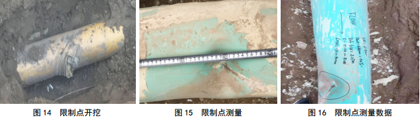 根據管道遺留存儲器數據讀取分析,里程存儲數據截止于A(yíng)點(diǎn)1號閥室外110 m處,與檢測器卡堵時(shí)A點(diǎn)壓力劇烈波動(dòng)點(diǎn)相吻合。開(kāi)挖后發(fā)現限制點(diǎn)凹陷(圖 14-16)。