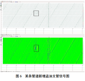 某條管道在內檢測完成兩年后首次進(jìn)行了打孔盜油專(zhuān)項內檢測,除識別出已修復的100多處盜油閥門(mén)外,現場(chǎng)開(kāi)挖又發(fā)現6處新增盜油支管,圖 6為一處新增支管的信號圖,圖 7為該支管現場(chǎng)照片。