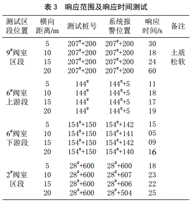 表3為響應范圍及響應時(shí)間測試結果。在各監測區段各選一個(gè)實(shí)驗點(diǎn),分別選擇垂直于管道走向5、10、 15、 20 m 四個(gè)測試點(diǎn),機械挖掘作為激勵源。結果顯示各個(gè)測試點(diǎn)均有報警輸出,所不同的是報警響應時(shí)間與測試點(diǎn)的土壤硬度有關(guān)。分析表明本系統能響應垂直于管道20 m范圍的挖掘行為,當管道周邊為干燥硬質(zhì)土壤時(shí)其總體響應時(shí)間在30 s內,若為松軟土壤,則其響應時(shí)間會(huì )相應延長(cháng)。