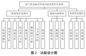 系統功能主要包括三維地理信息模塊、基礎功能模塊、系統管理模塊,實(shí)現三維場(chǎng)景操作、統計分析、地質(zhì)環(huán)境信息查詢(xún)統計等功能。見(jiàn)圖 2。