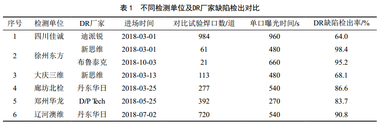 DR在閩粵支干線(xiàn)上優(yōu)先檢測金口、連頭焊口、返修以及穿越焊口。 DR檢測在數據儲存和傳輸、圖譜的數字化分析及圖像靈敏度方面更加具有優(yōu)勢。不同檢測單位及DR廠(chǎng)家缺陷檢出對比見(jiàn)表 1。