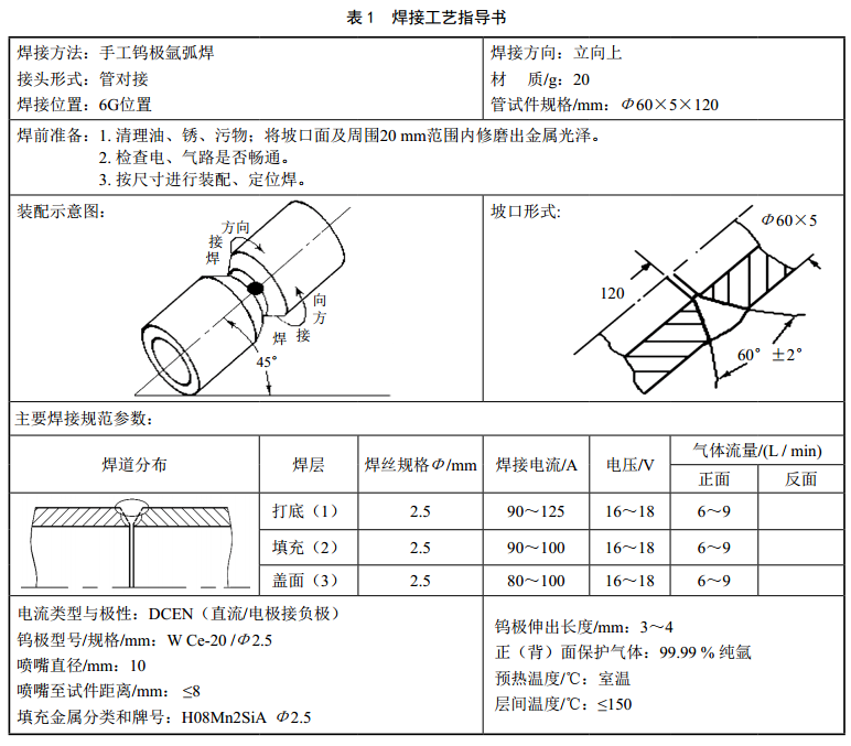 小直徑薄壁管對接6G位置手工鎢極氬弧焊焊接工藝指導書(shū)見(jiàn)表 1。