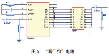 “看門(mén)狗”電路是成熟技術(shù),其CD4060是帶振蕩器的14位計數器,振蕩頻率 f 由 RT、 CT決定。R S用于改善振蕩器的穩定性, R S要大于RT。一般取RS =10 RT,且RT >1 kΩ, CT ≥100 pF。如果RS=450 Ω, RT=45 Ω, CT =1 uF,則 f =10 Hz。 4060的振蕩頻率和Q i( i=6, 7, 8, 9, 10, 12, 13, 4)的選擇要根據情況確定。設程序實(shí)際所需工作周期為T(mén) ,分頻器記滿(mǎn)時(shí)間為T(mén)' ,當 T' >T 且系統正常工作時(shí),程序每隔 T 對4060掃描一次,分頻且永無(wú)記滿(mǎn)輸出信號。如系統工作不正常(如程序跑飛、死循環(huán)等),程序對4060不發(fā)出掃描信號,分頻器記滿(mǎn)輸出脈沖信號使CPU復位。
