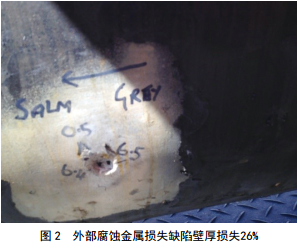 金屬損失是引起管道缺陷最常見(jiàn)的問(wèn)題,是已知許多腐蝕問(wèn)題的根源(金屬損失也可能由于機械損壞或施工問(wèn)題而發(fā)生)。該案例管道于2009年檢測時(shí),工程人員發(fā)現了嚴重缺陷并進(jìn)行了修復。 2015年再次檢測,并計劃維修壁厚損失約20% 的兩處缺陷。因缺陷位置未知,在500 m長(cháng)的管道上進(jìn)行了SCT檢測 。經(jīng)結果對比,第一處缺陷與SCT的報告相符,并且為應力水平最高的缺陷,其應力水平為材料最小屈服強度 (SMYS)的67% ,而內檢測報告的壁厚損失為26% 。圖 2為2015年管道缺陷圖片。