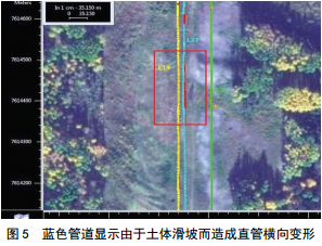 檢測管壁應力而非幾何尺寸變化的另一個(gè)優(yōu)點(diǎn)是可以檢測到給管道施加局部應力的任何外部載荷,但 SCT無(wú)法確定應力集中的根源。 在這種情況下,這種技術(shù)的另一種能力也變得非常有益,即SCT關(guān)于管道路線(xiàn)及其埋深報告數據有助于確定因地下土體運動(dòng)引起的管道嚴重變形。 報告顯示管道埋深發(fā)生了變化,表明管道遭受了地質(zhì)滑坡的影響。 同一區域管道向上彎曲而造成應力值較高的SCZ,表明地下土體運動(dòng)對管道造成了結構性破壞。 圖 5為管道橫向變形的頂視圖。