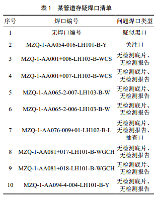 通過(guò)收集各在役管道工程竣工資料和內檢測資料,復查竣工資料和施工記錄、監理記錄、無(wú)損檢測報告符合性和一致性,完成內檢測環(huán)焊縫數據和施工記錄對齊。識別疑似“黑口”,對內檢測公司提供的管道漏磁內檢測信號數據進(jìn)行復核,識別“嚴重”“較嚴重” “輕微”異常焊口,并開(kāi)列“嚴重”異常焊口底片復核影像資料,聘請專(zhuān)家復核無(wú)損檢測底片,提出存疑焊口,形成存疑焊口清單(表 1)。