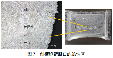另一方面,焊接時(shí)如果單道熔敷金屬較厚,則后 一焊道不能對前一焊道充分回火,會(huì )有一定比例的未回火貝氏體鐵素體存在于焊縫金屬內。例如,焊縫金屬刻槽錘斷試驗斷口未見(jiàn)明顯焊接缺陷,但可見(jiàn)部分樣品存在不同程度的脆性區(圖 7),在該區域中可見(jiàn)粗大的貝氏體鐵素體,貝氏體板條間可見(jiàn)鏈狀M-A組元,這類(lèi)組織具有較好的強度,但韌性偏低,是環(huán)焊縫脆斷的冶金因素。