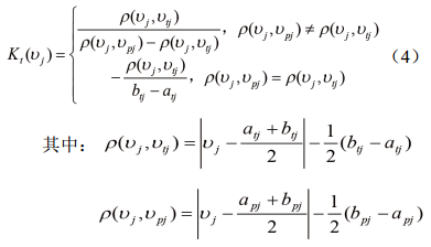 可拓理論引進(jìn)距的概念來(lái)確定關(guān)聯(lián)度,從而將實(shí)變函數點(diǎn)與量值范圍之間的關(guān)系由“類(lèi)內為同”拓展為“類(lèi)內存異”。域內任意一點(diǎn)υj與經(jīng)典域<atj, btj>和節域<apj, bpj>的關(guān)聯(lián)函數Kt(υj)見(jiàn)式(4)。