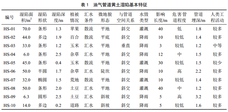 據2019年地質(zhì)災害調查資料,該區域共發(fā)育災害109處,其中黃土濕陷54處,占發(fā)育災害總量的49.54%。隨機選取10處黃土濕陷作為研究對象,依據SY/T 6828―2017《油氣管道地質(zhì)災害風(fēng)險管理技術(shù)規范》,對濕陷面積、濕陷形狀、濕陷最大深度、植被情況、匯水條件、微地貌形態(tài)、與管道空間關(guān)系、水毀類(lèi)型、影響長(cháng)度等進(jìn)行調查、測量與定性評判,基本特征見(jiàn)表 1。
