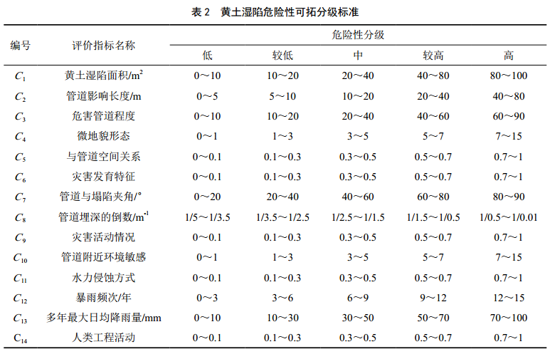 油氣管道黃土濕陷危險性影響因素較多、時(shí)空差異性較大,故參評因子選取是否合理直接影響評價(jià)結果的準確性和實(shí)用性。筆者在野外調查、災害分析和PGRMS應用基礎上,結合已有學(xué)者研究成果,選取黃土濕陷面積(C1)、管道受影響 長(cháng)度(C2)、危害管道程度(C3)、微地貌形態(tài)(C4)、與管道空間關(guān)系(C5)、災害發(fā)育特征(C6)、管道與塌陷夾角(C7)、管道埋深的倒數(C8)、災害活動(dòng)情況(C9)、管道附件環(huán)境敏感性(C10)、水力侵蝕方式(C11)、暴雨頻次/年(C12)、多年最大日均降雨量(C13)、人類(lèi)工程活動(dòng)(C14)等14個(gè)影響因素作為可拓物元模型的評價(jià)指標。