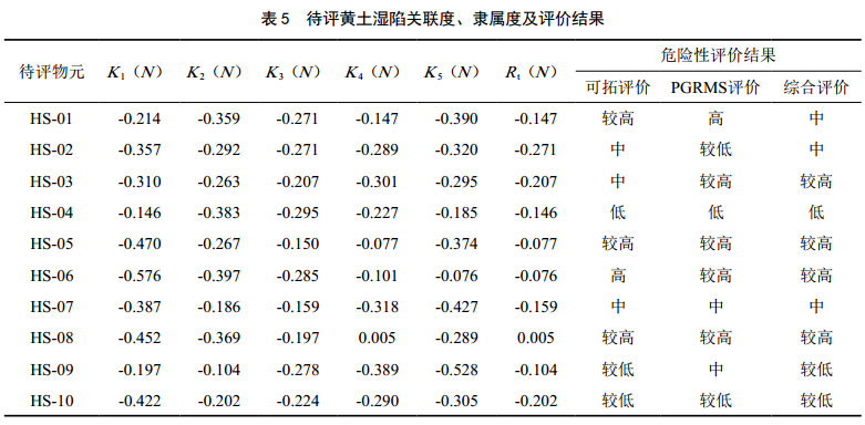 通過(guò)式(4)得待評物元黃土濕陷HS-01~HS-10與風(fēng)險等級j1~j5之間的關(guān)聯(lián)系數K t(υj);結合評價(jià)指標權系數ωj,由式(12)、式(13)計算得待評物元危險性關(guān)聯(lián)度Kt(N )和隸屬度Rt(N ),詳情及其對應的危險性等級見(jiàn)表 5。