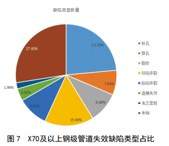 缺陷類(lèi)型主要為腐蝕穿孔(針孔、穿孔)、開(kāi)裂(環(huán)向開(kāi)裂、縱向開(kāi)裂、裂紋),其中腐蝕穿孔為16起,占比31.4%,開(kāi)裂為18起,占比35.3%(圖 7)。