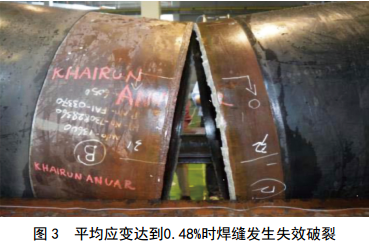 試驗二:采用具備高應變能力的焊接工藝規程。根焊采用E7016-H4,熱焊、填充和蓋帽都采用E9045-P2 H4R,手工電弧焊堿性實(shí)心焊條。環(huán)焊縫機械性能測試報告顯示,拉伸強度613~670 MPa,符合API標準(570~760 MPa)規定。焊縫、熱影響區和母材的沖擊功分別為160 J、 281 J和298 J。試驗結果顯示:失效發(fā)生在母材位置,失效時(shí)的拉伸應變大于3%(在根部預制了深2.9 mm、長(cháng)190 mm、寬0.7 mm的缺陷,并伴有2 mm錯邊)。見(jiàn)圖 4、圖 5。