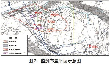 為進(jìn)一步分析、評價(jià)滑坡穩定性,保證搶險現場(chǎng)施工人員安全以及專(zhuān)項處置措施順利實(shí)施,采用了位移監測、管道應力應變監測和非接觸式磁異常檢測等全方位智能管控措施(圖 2)。