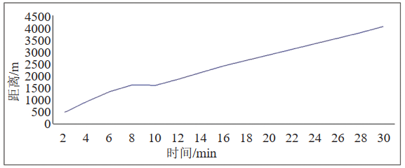 埋地含硫天然氣管道泄漏初期,由于管道上層多孔介質(zhì)對泄漏氣體的影響,使其不能形成高速射流。氣體進(jìn)入土壤后,土壤的毛管壓力、土壤阻力和地表的張力對泄漏氣體的共同作用,使泄漏氣體的湍能大量減少,但持續泄漏使氣體的湍能不斷增大,仍會(huì )通過(guò)土壤迅速且持續不斷地涌出地表,進(jìn)入大氣進(jìn)行射流運動(dòng)和擴散運動(dòng)。土壤作為多孔介質(zhì),具有一定的孔隙度和獨特的儲存能力。一定面積的土壤飽和后,氣體將會(huì )繼續向土壤橫向擴散,造成更大面積的污染,同時(shí)縱向方面氣體將滲出土壤外地表,消耗氣體動(dòng)能。因此,在短時(shí)間內有大量的高濃度含硫天然氣聚集在泄漏口附近的地表處。隨著(zhù)時(shí)間的推移大量泄漏氣體進(jìn)入環(huán)境中,其主要有毒危害氣體為硫化氫氣體。在低空處,泄漏2 min時(shí),硫化氫有毒云團距離泄漏口下方向475 m;泄漏8 min時(shí),距離1637 m;泄漏10 min~30 min內,距離近似呈線(xiàn)性增長(cháng),在30 min時(shí),距離達4045 m( 圖 1)。泄漏趨于穩定后,硫化氫有毒云團距離泄漏口下方向超過(guò)4800 m,高為248 m(圖 2)。