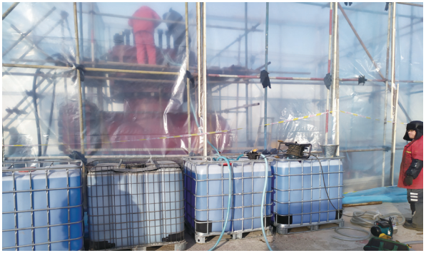 試驗場(chǎng)地采用腳手架外罩塑料大棚方式,水平開(kāi)孔試驗圍擋帶上蓋,刀具安裝位置留出空檔便于吊裝;垂直封堵試驗吊裝頻率高,只圍擋四周即可(圖 3)。在此基礎上,再增加熱風(fēng)輸送,使現場(chǎng)實(shí)際作業(yè)溫度升至﹣10℃左右,達到了常規開(kāi)孔封堵設備適用的溫度范圍,改善了作業(yè)工況。