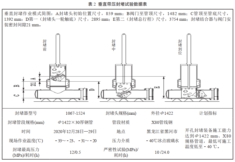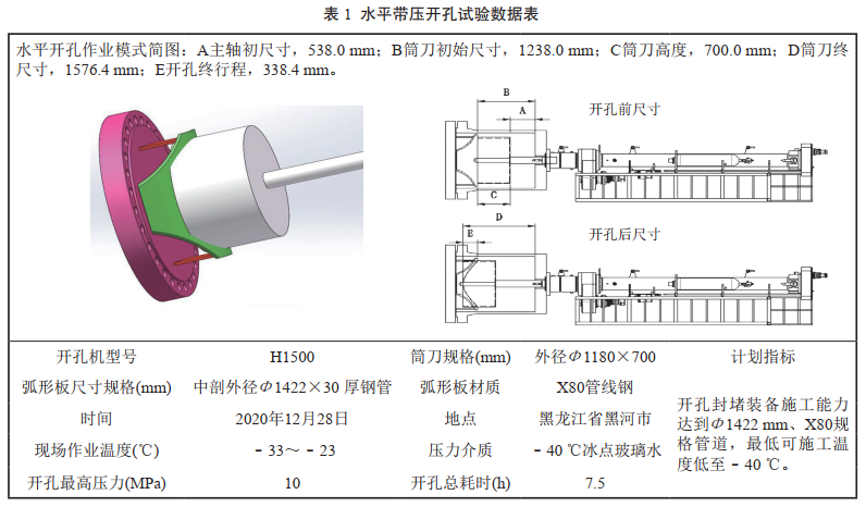 油氣管道帶壓開(kāi)孔封堵技術(shù)在應對管道不停輸損壞更換、移線(xiàn)改線(xiàn)、外引支線(xiàn)中較為常用[1]。國內已有帶壓開(kāi)孔封堵技術(shù),最大用于Φ1219 mm管道。中俄東線(xiàn)Φ1422 mm管道建成后,公司開(kāi)發(fā)了Φ1422 mm大口徑管道帶壓開(kāi)孔封堵式維搶修技術(shù)和裝備。2020年12月,課題組選擇東北﹣33℃至﹣23℃的氣候條件對該技術(shù)進(jìn)行低溫環(huán)境驗證試驗,取得了成功。