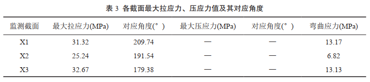 如圖 3所示,在管道外壁A(yíng)、B、C 3個(gè)監測點(diǎn)安裝應變計測量各點(diǎn)應變值,即可計算管道截面內任意點(diǎn)的應變值大小,由胡克定律,計算得到監測截面的最大應力值。據此可長(cháng)期監測管道截面實(shí)時(shí)應力大小及變化趨勢。按照QSY 1672―2014《管道滑坡災害監測規范》,將管道地質(zhì)災害風(fēng)險分為藍色、黃色、紅色三個(gè)等級預警,對應的管道附加應力達到管道拉(壓)應力允許值分別為30%、60%、90%。