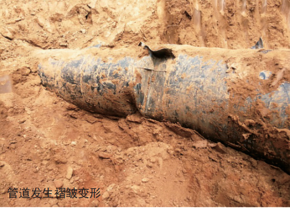 山西煤層氣(天然氣)集輸有限公司所屬天然氣管線(xiàn)通過(guò)某煤礦采空區段約1000 m。2019年6月11日,巡線(xiàn)人員發(fā)現地面異常沉降開(kāi)裂,站場(chǎng)立即與礦權方確認,發(fā)現該處地下煤礦的采掘位置已臨近輸氣管道下方,隨即向調度中心匯報;經(jīng)組織專(zhuān)家現場(chǎng)勘查及再次確認后,對涉及管道進(jìn)行開(kāi)挖,發(fā)現管道出現兩處褶皺變形。