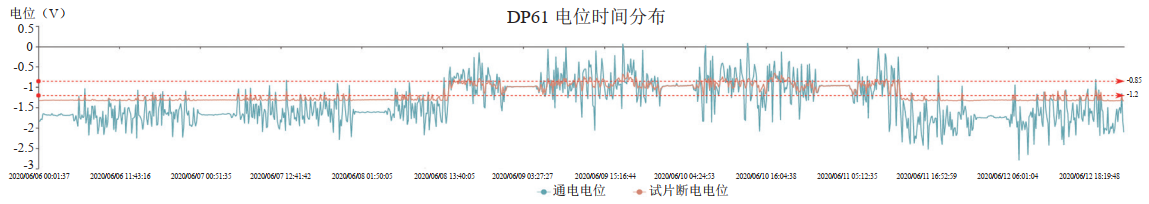 (4)鄰近管道恒電位儀運行狀態(tài)對管道電位的影響。2020年6月8日至6月11日,DP61智能測試樁通/斷電電位正向偏移且IR降發(fā)生明顯變化,經(jīng)核實(shí),為DP管段鄰近管道2#閥室恒電位儀意外停機所致(圖 2)。
