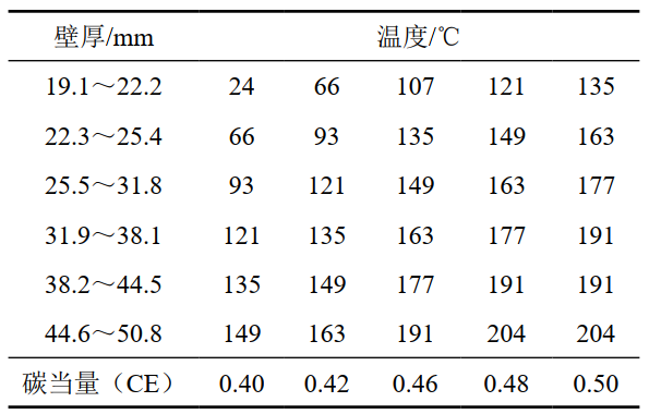 (3) 預熱溫度。阿美標準推薦的橫焊縫預熱溫度[2]如表 1所示,需結合對全包管件壁厚的要求[3]。