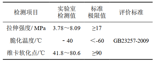 補口帶外觀(guān)形貌普遍完好。實(shí)驗室檢測結果表明,補口帶的拉伸強度、脆化溫度和維卡軟化點(diǎn)檢測值均低于標準要求范圍(表 2),且補口帶存在斷層現象,綜合檢測結果表明補口帶老化程度較為嚴重。