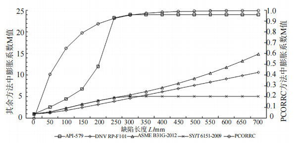 采用文獻[11]中的數據進(jìn)行分析,分別使用ASME B31G―2012、DNV RP-F101、PCORRC、SY/T 6151―2009、API-579來(lái)對比腐蝕長(cháng)度L對膨脹系數M的影響,如圖 2所示。