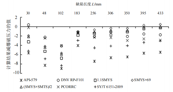 圖 6 各方法計算結果與爆破壓力差值隨缺陷長(cháng)度L變化圖