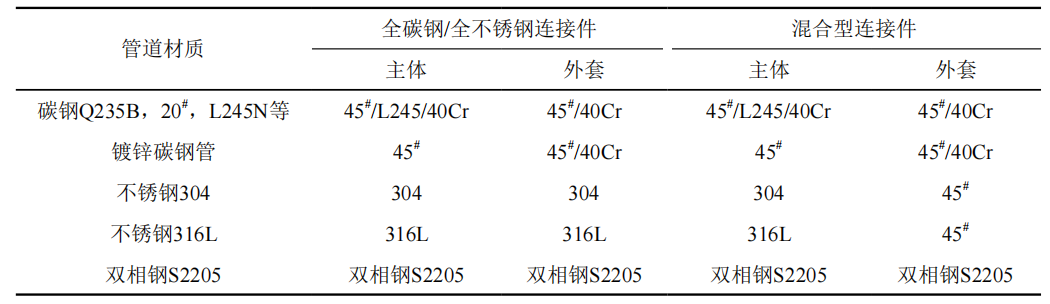 (2)連接件主體材質(zhì)硬度和其他參數值需高于或等于管道材質(zhì)硬度和其他參數值(表 1)。